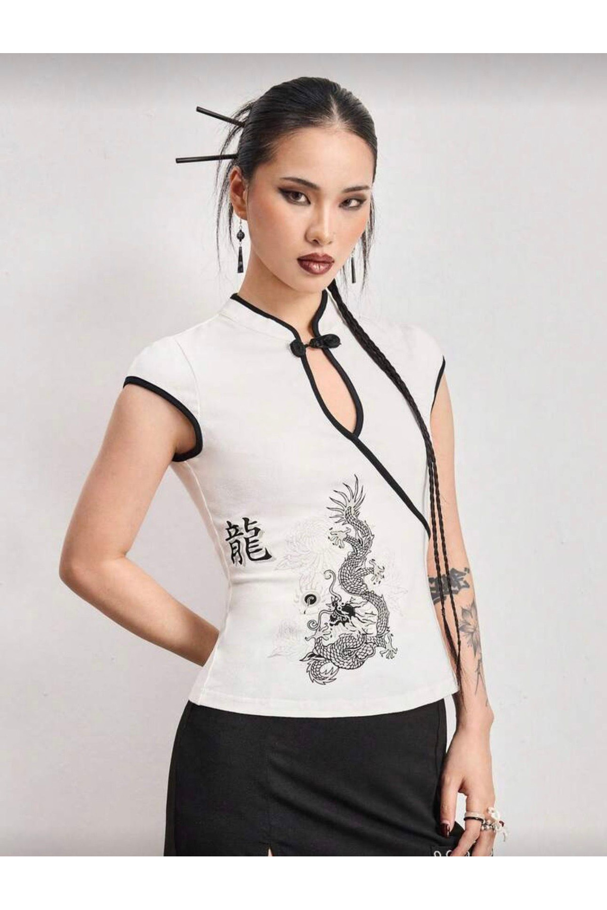 Gofeel Colar Ejder Baskılı Çin Düğmeli Bluz