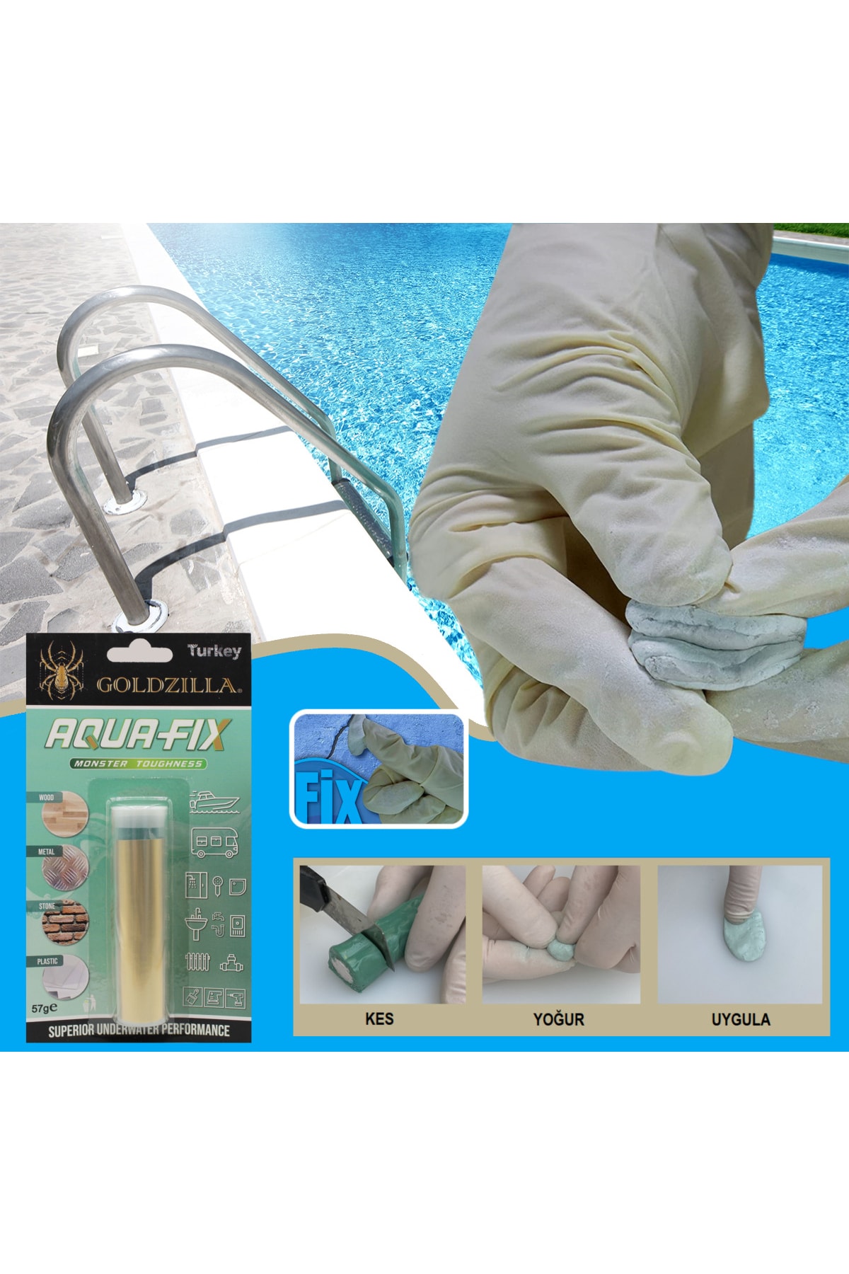 GOLDZİLLA Aquafix Havuz Kaçak Su Altı Tamir Onarım Yapıştırıcı Epoksi Kaynak Macun 57 Gr (dolgu , Yapıştırma)