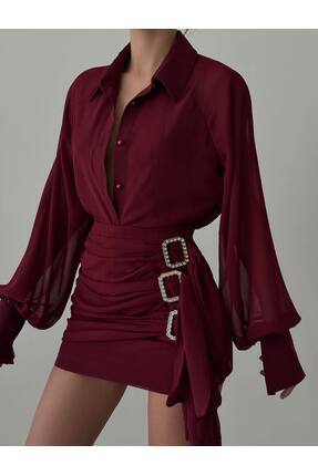 EXPLOSION Gold Aksesuarlı Önden Yırtmaçlı Şık Elbise