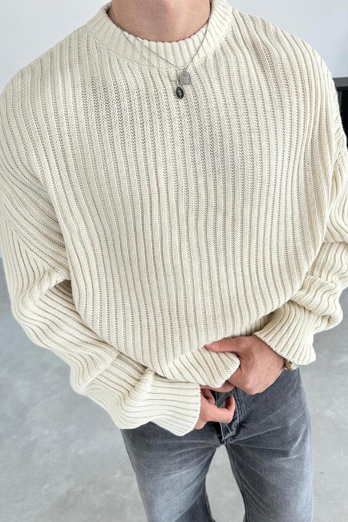 hafkagiyim Krem Bisiklet Yaka Fitilli Oversize Triko Kazak