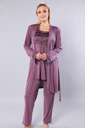 LOHOUSE Kadın Özel Dantelli Tasarım Lohusa Hamile Sabahlıklı 3'lü Pijama Takım Set