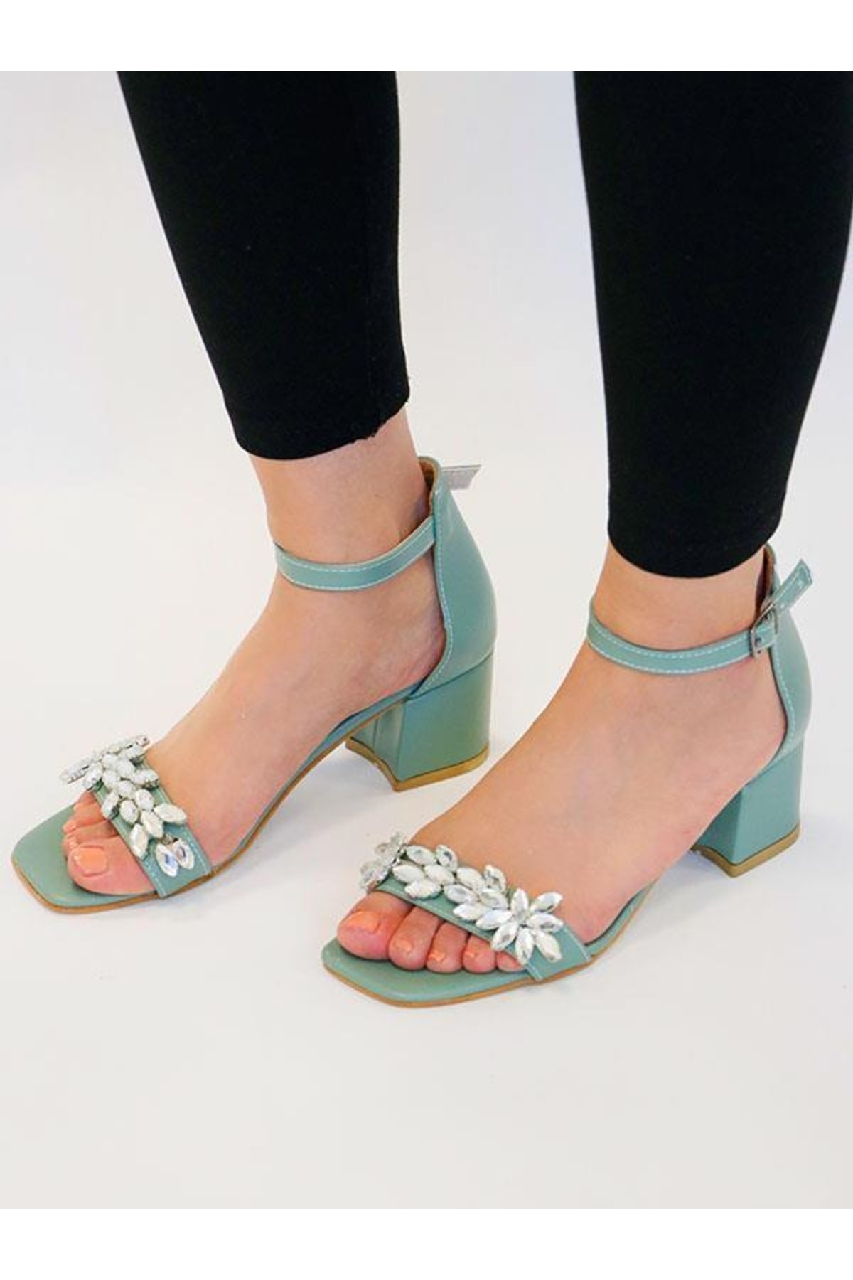HeySey Moda Blomma Çiçek Desenli Tek Bant Topuklu Ayakkabı Su Yeşili
