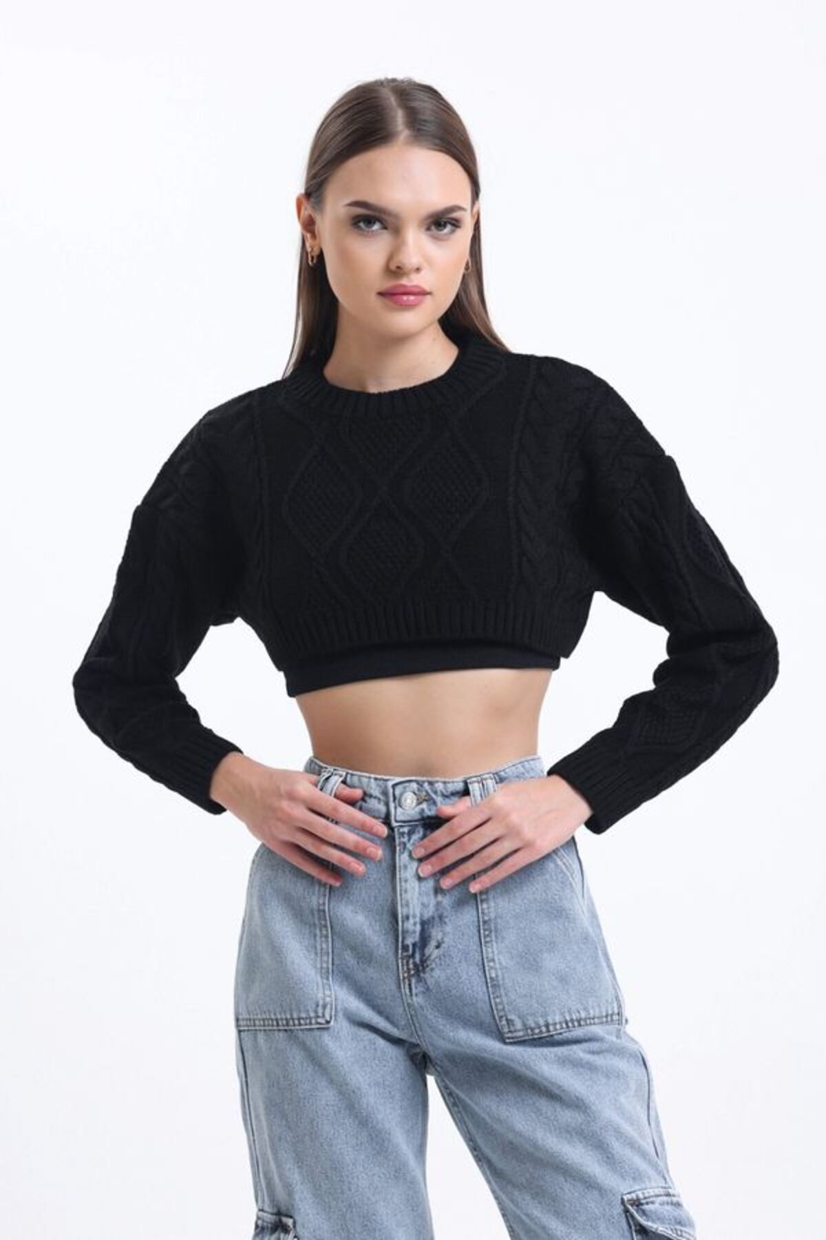 Hiccup Kablolu Örgü Düz Bisiklet Yaka Kısa Kazak