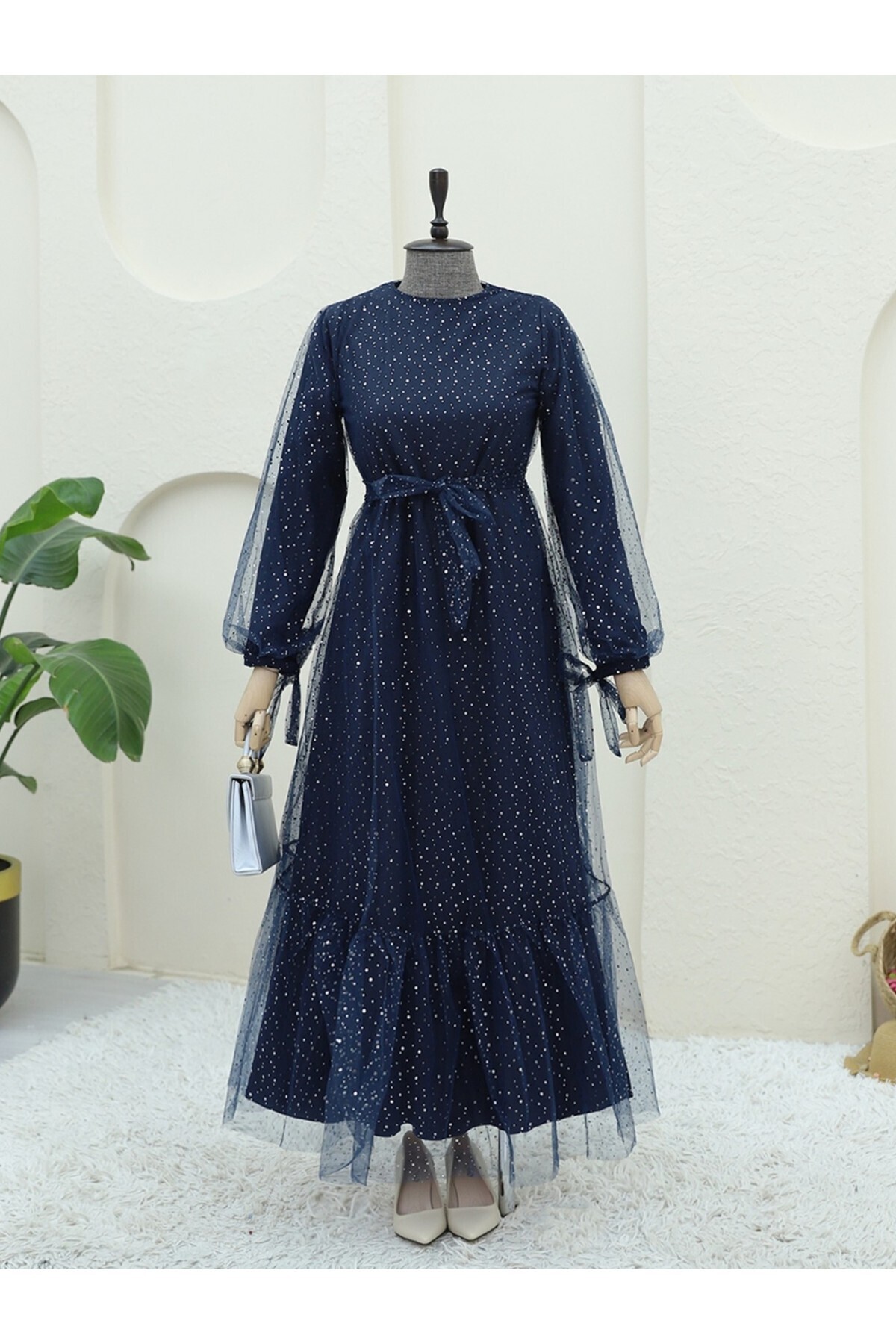 HİJABAYA Serpme Pul Detaylı Kolu Bağcıklı Tül Elbise