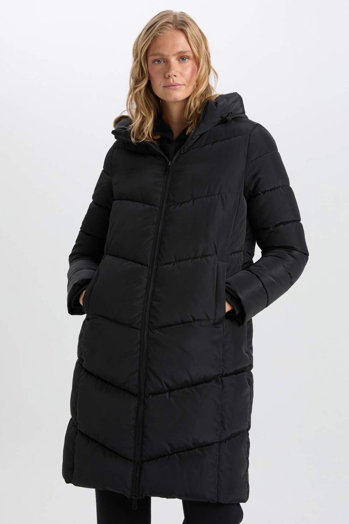 Defacto Vízlepergető hosszú felfújható kabát Parka hőszigetelő kapucnis steppelt cipzáras zsebekkel A3174ax24wn