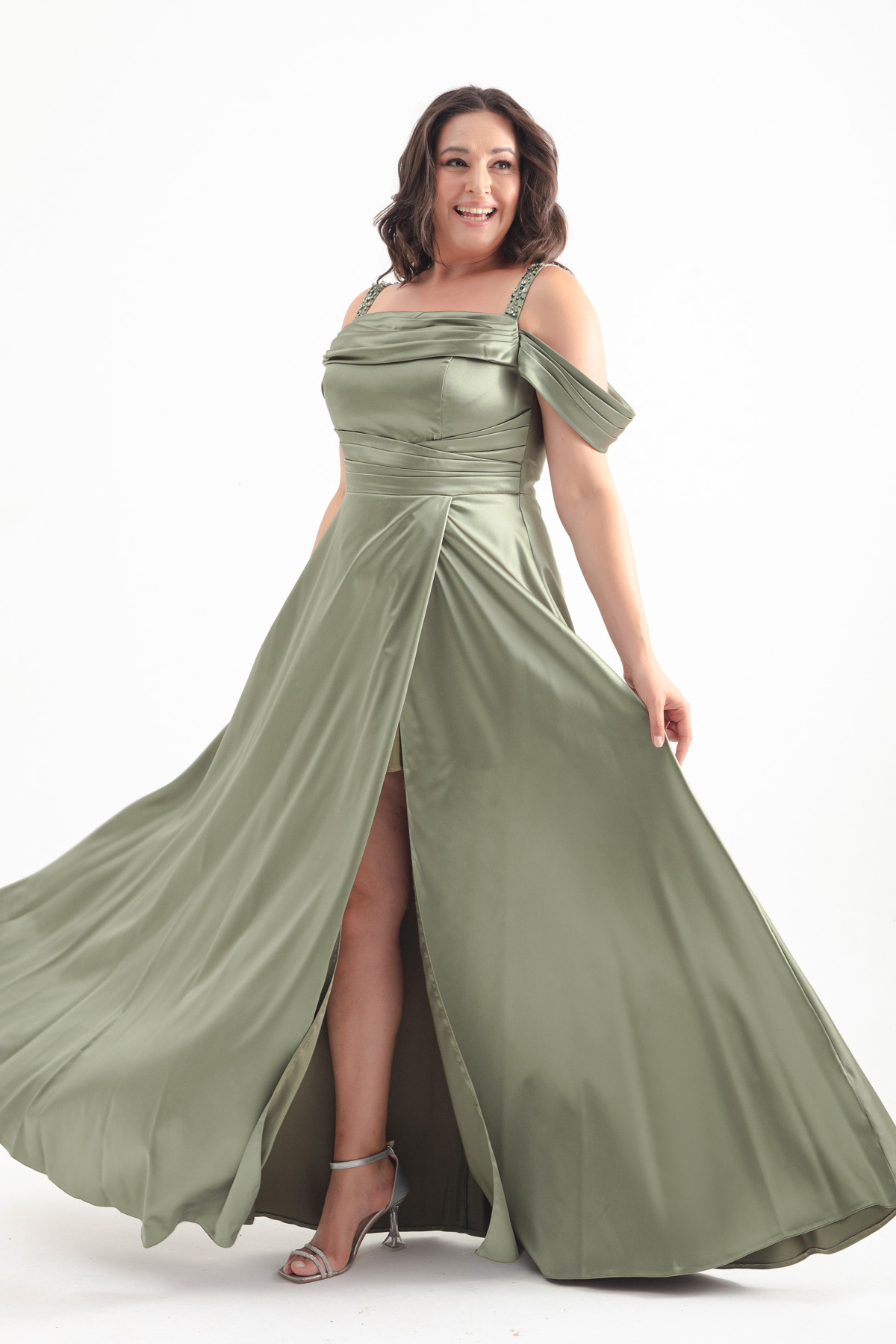 Lafaba Női khaki színű, szűk szabású, kőpántos, drapériás, nagyméretű, hosszú estélyi ruha jellemzők