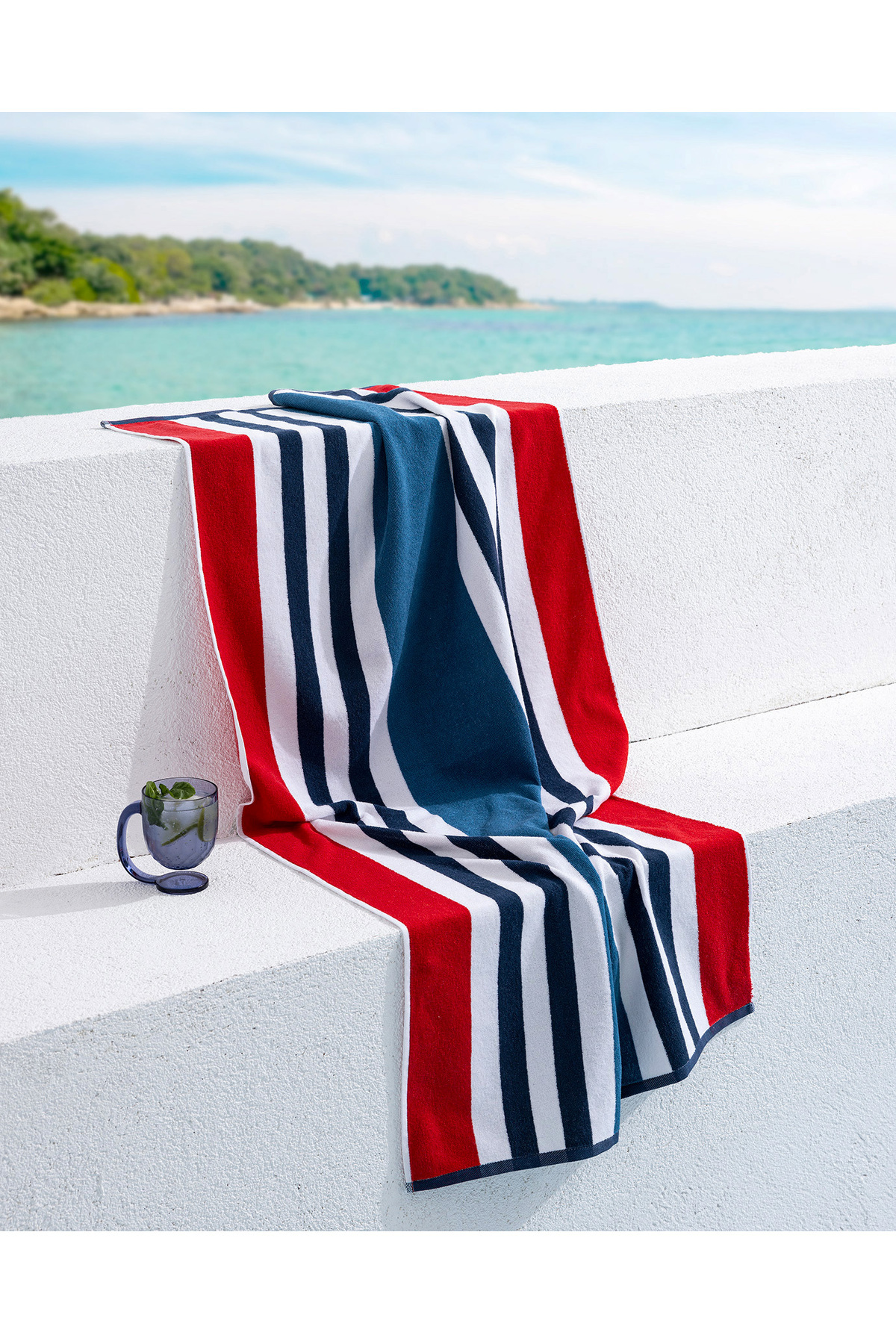 Madame Coco Denney 100% pamut sötétkék/piros strandtörölköző - 70x150 cm