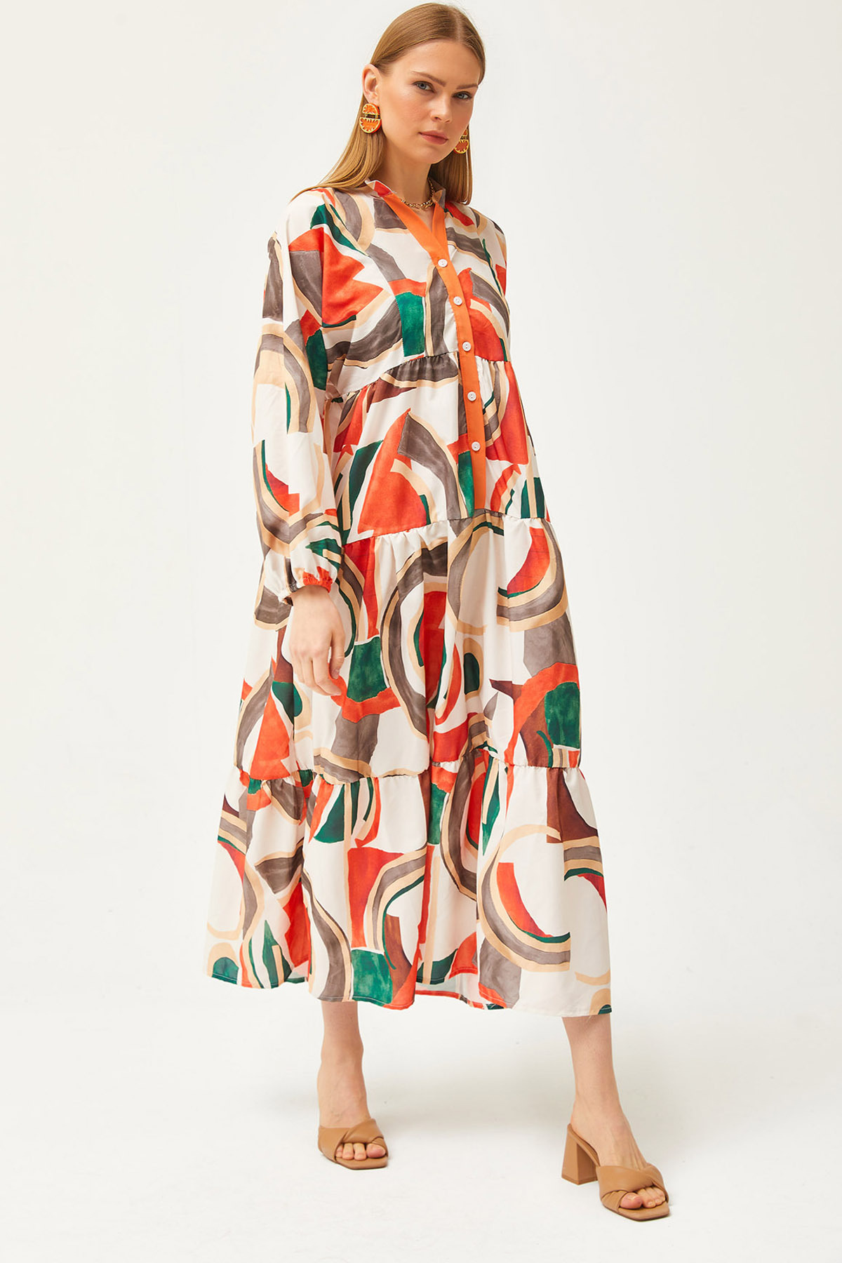 Olalook Női Kupra narancssárga gallér, részletes gombos bő maxi ruha ELB-19002057