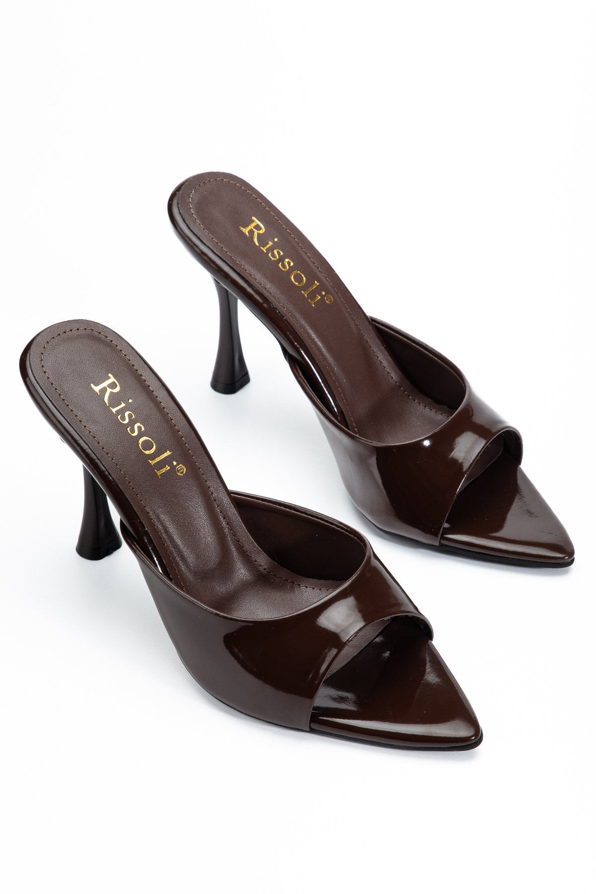 RİSSOLİ Rissoli női keserűbarna hegyes orrú sarkú szandál jellemzők