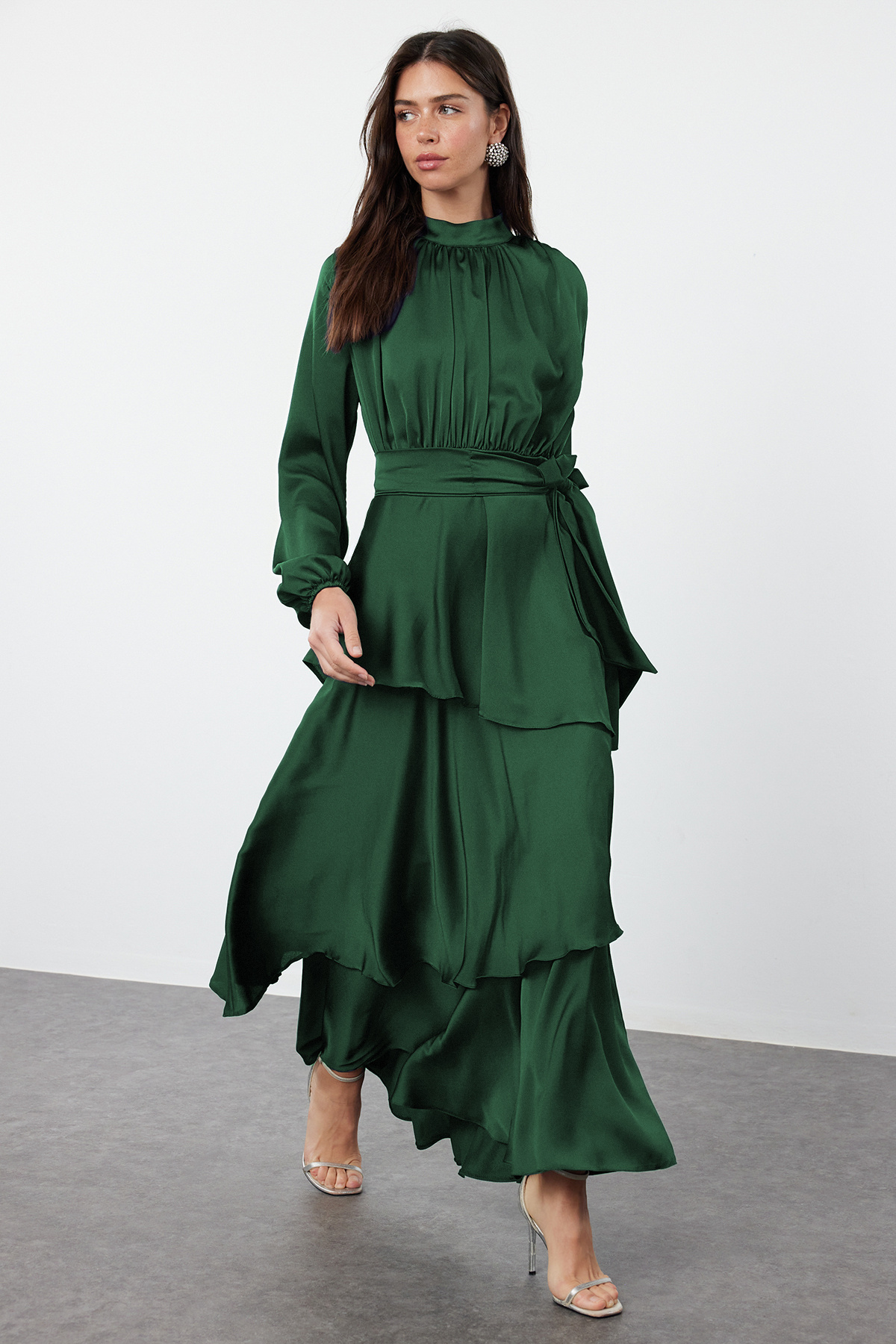 Trendyol Modest Sötétzöld smaragd réteges szatén szőtt estélyi ruha / estélyi ruha