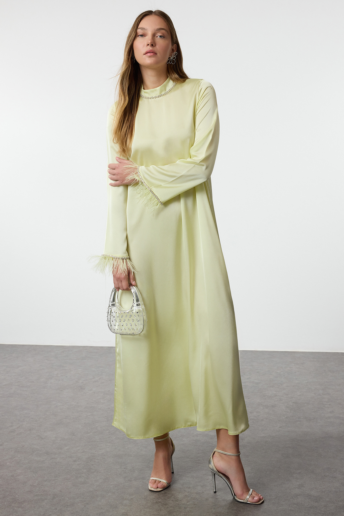 Trendyol Modest Világos Khaki Otriş részletes szatén szőtt estélyi ruha Jalabiya ruha TCTAW25DB00004