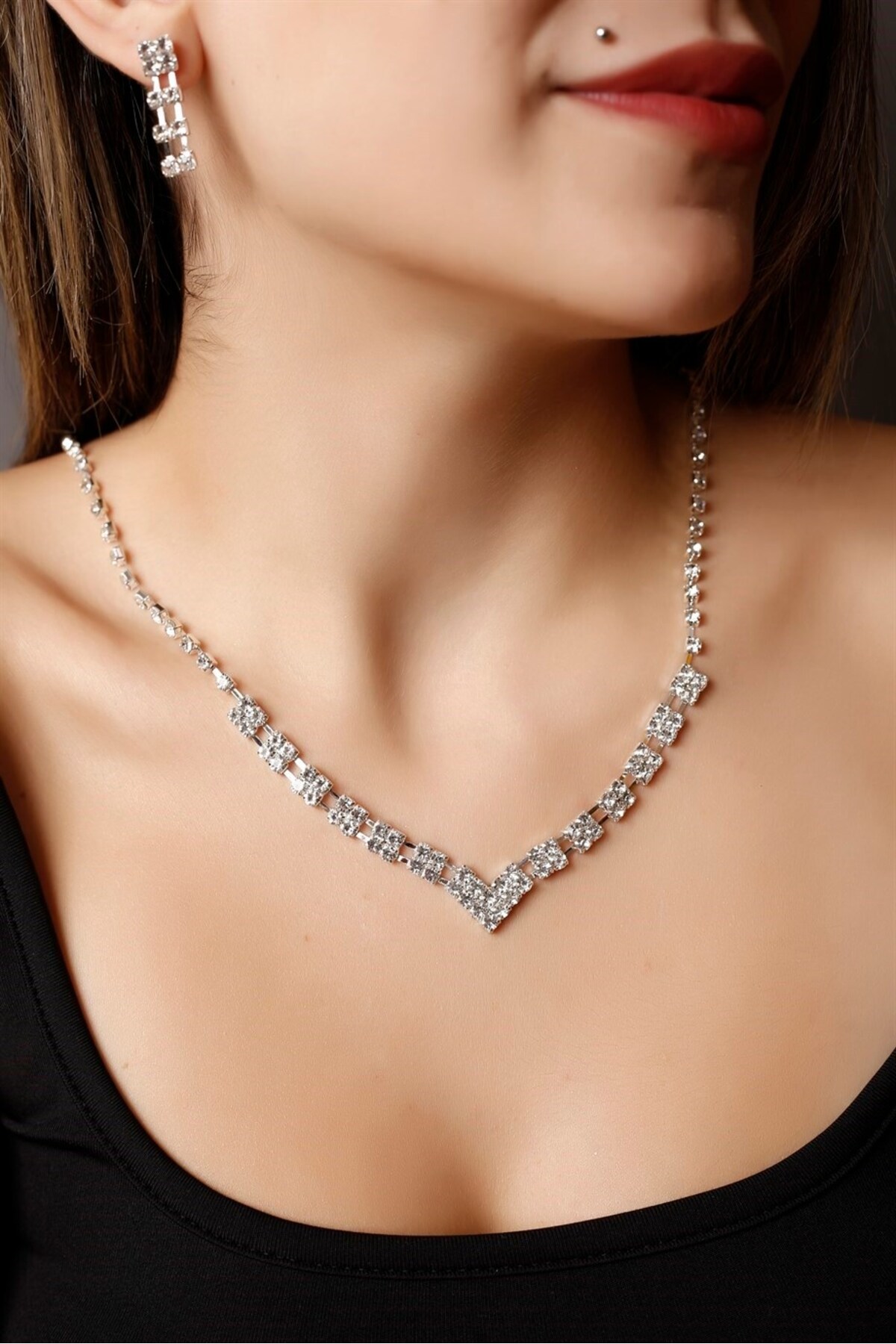 HUBANN Gümüş Kaplama Stylish Desenli Su Yolu Seti Nişan Takı Seti Düğün Seti Abiye Seti Kolye Küpe Seti