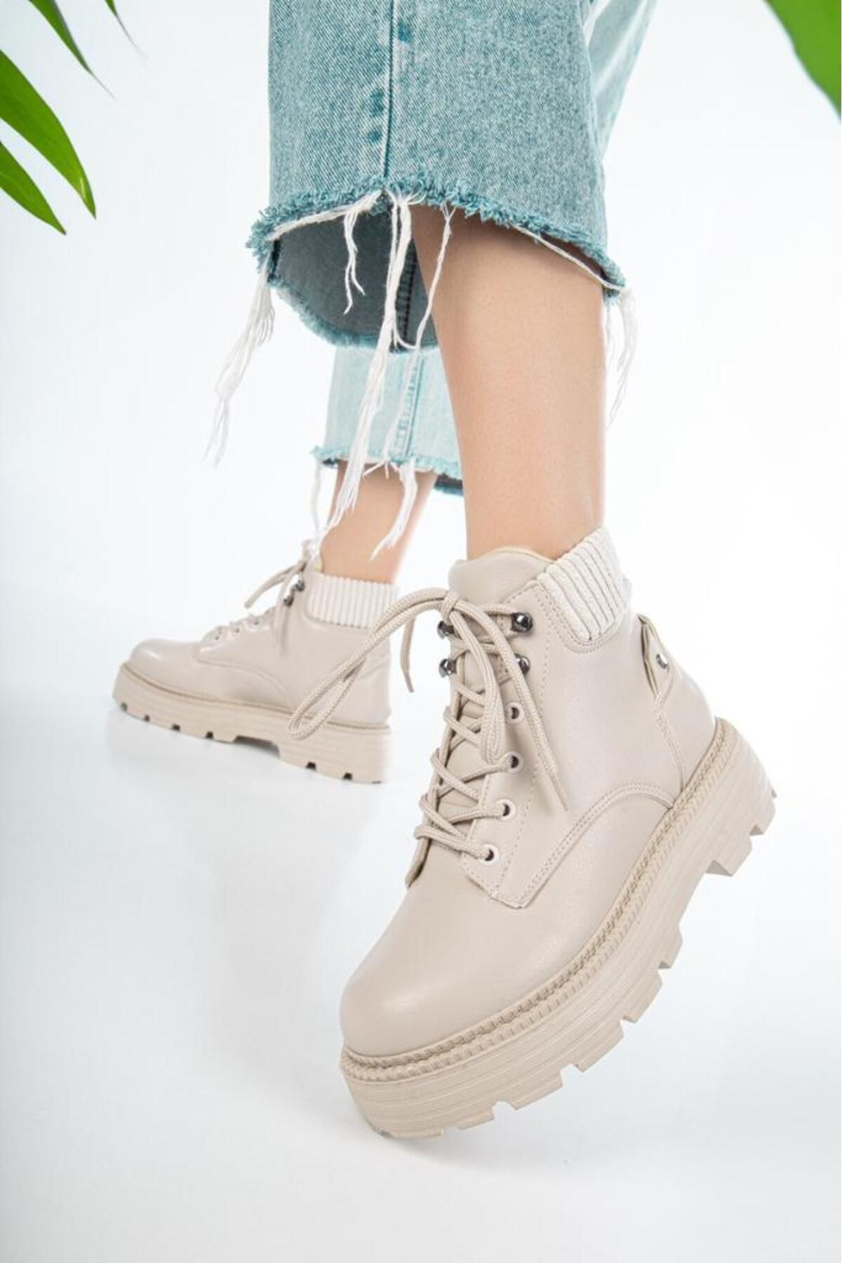 İA İLERİADIM Krem Cilt Bağcıklı Su Geçirmez Yüksek Taban Kadın Bot