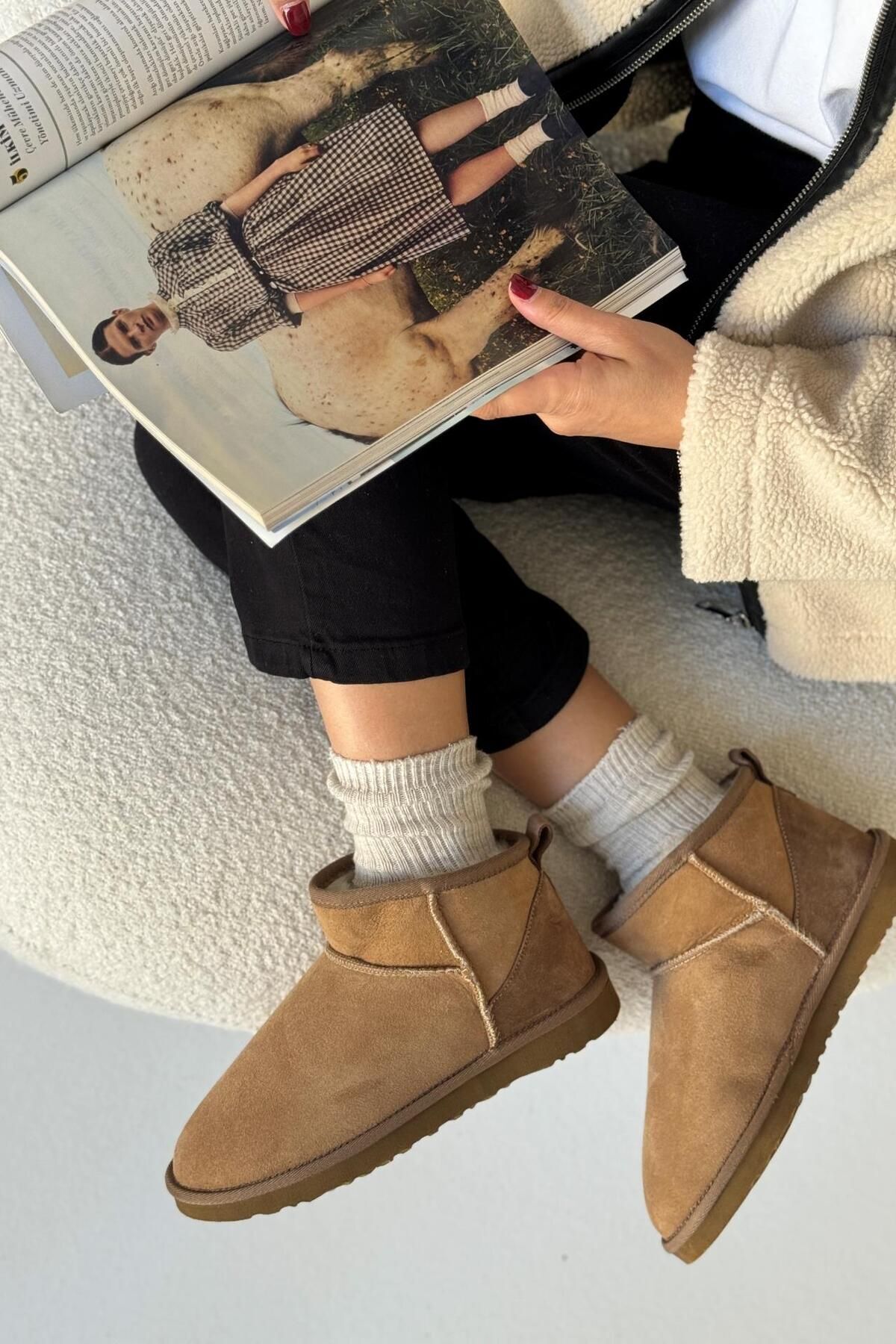 ICELAKE Destino Kadın Süet Taba Mini İnce Tabanlı Tüylü Kısa Bot