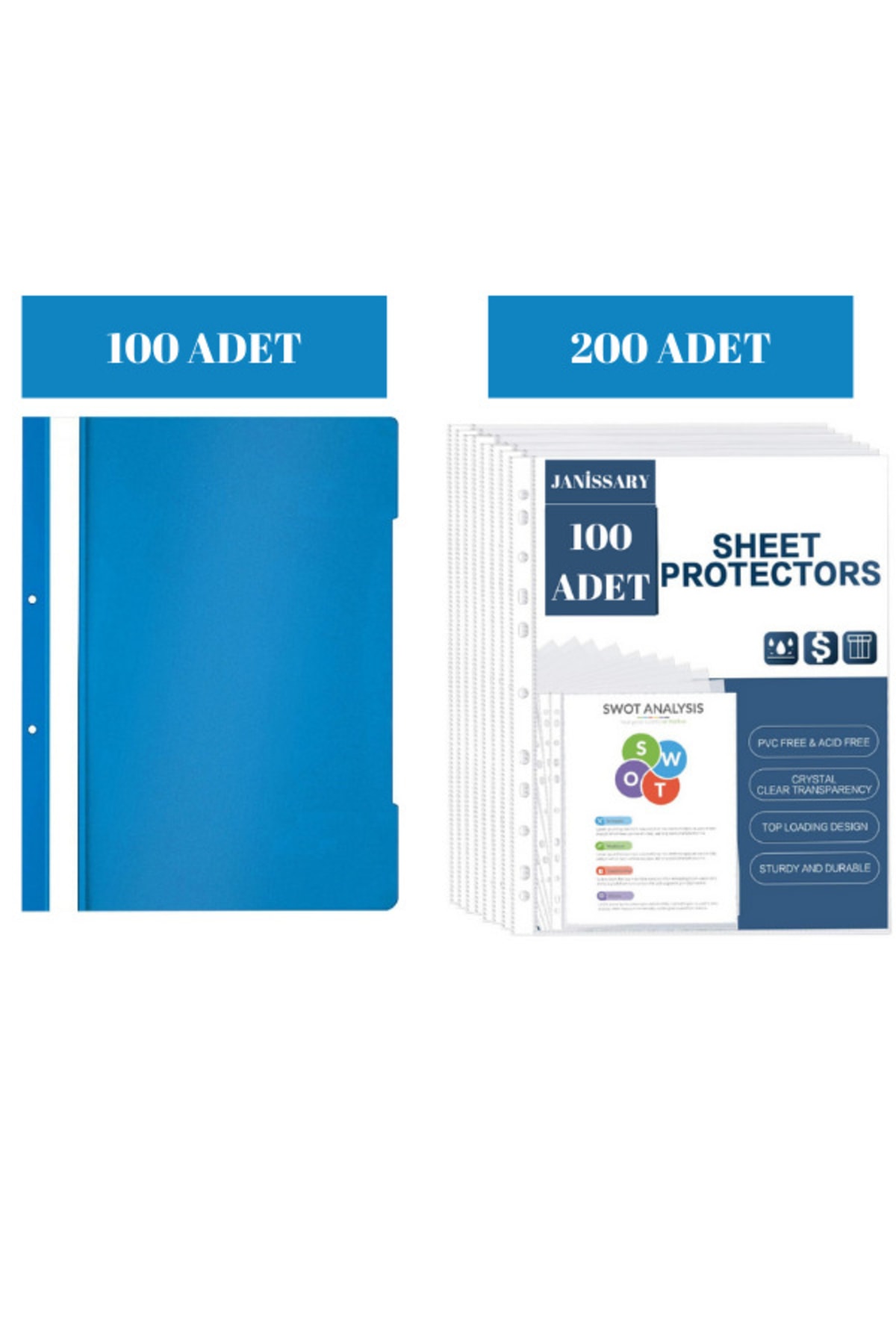 Janissary 200 Adet Poşet Dosya, Şeffaf Kağıt Koruyucu - 100 Adet Telli Plastik Mavi Dosya Özellikleri