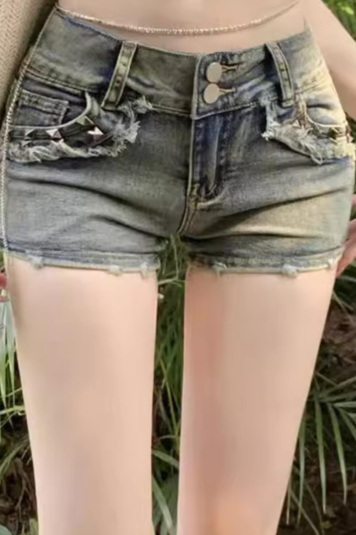 Karakedi Mavi Eskitme Y2k Style Piramit Zımba Detay Kot Kısa Şort