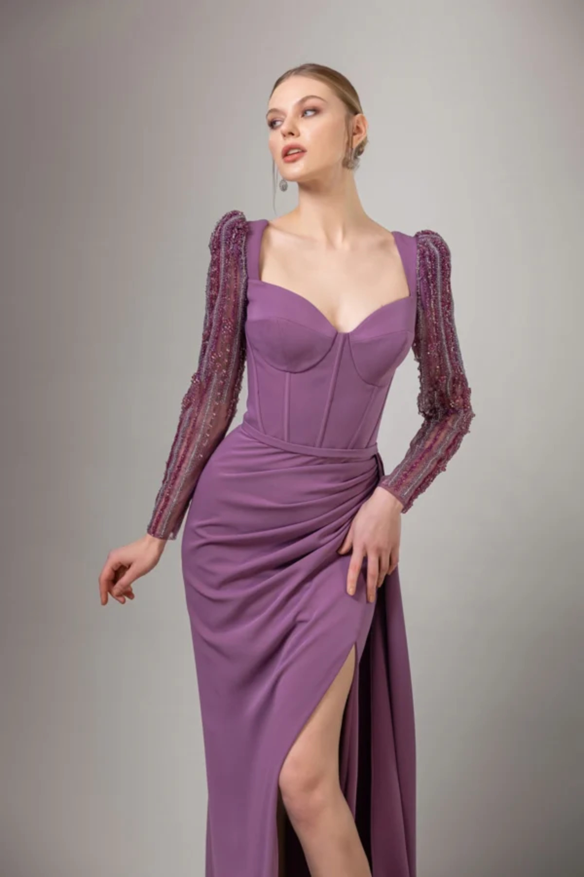 Kenzel İşlemeli Uzun Kollu Yırtmaçlı Uzun Elbise Özellikleri
