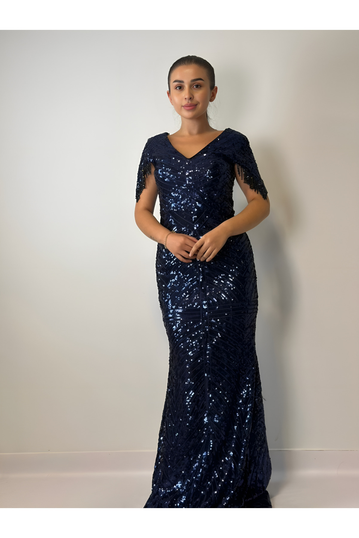 KIBRA DESİGN Koyu Mavi V Yaka Uzun Pullu Payet Balık Model Abiye – Gece ve Davet Elbisesi