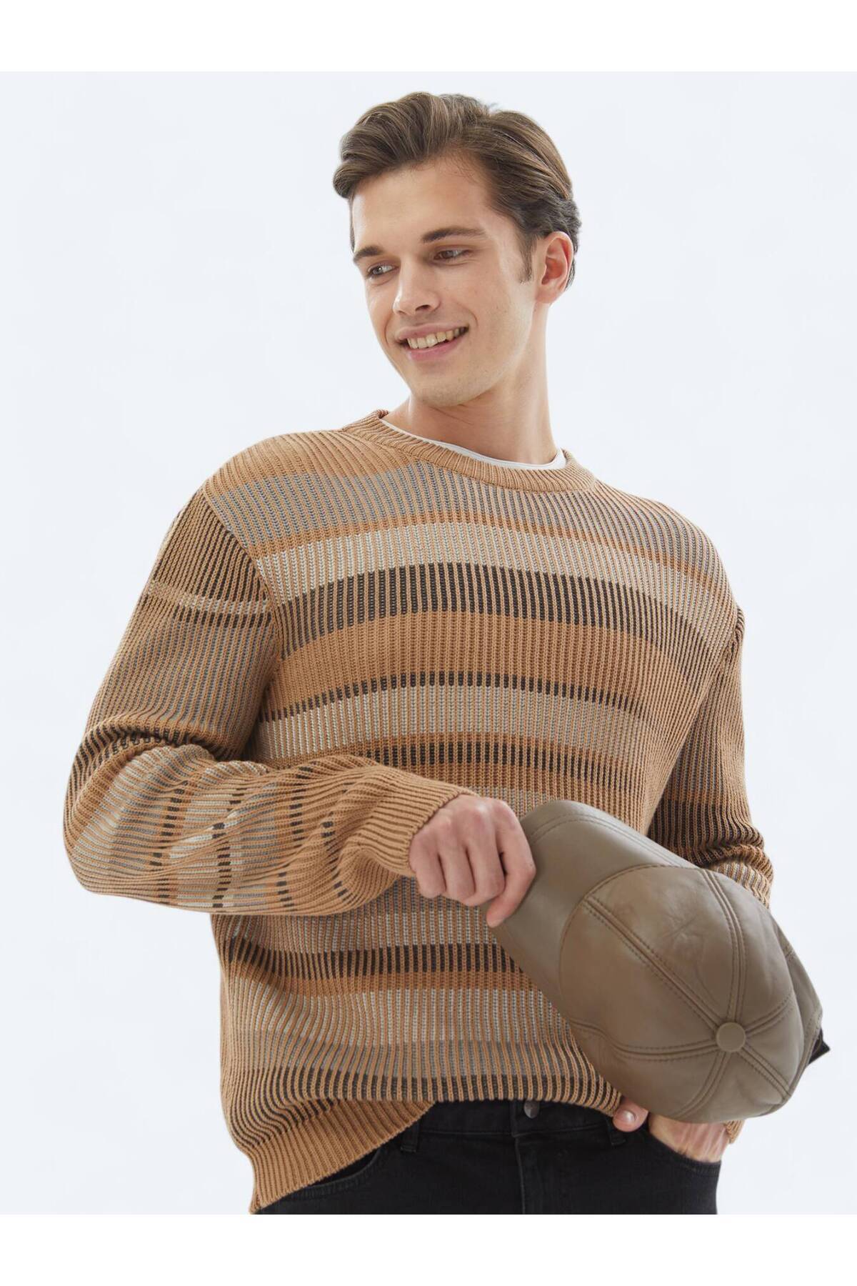Kip Deve Tüyü Bisiklet Yaka Desenli Pamuk Karışımlı Triko Kazak