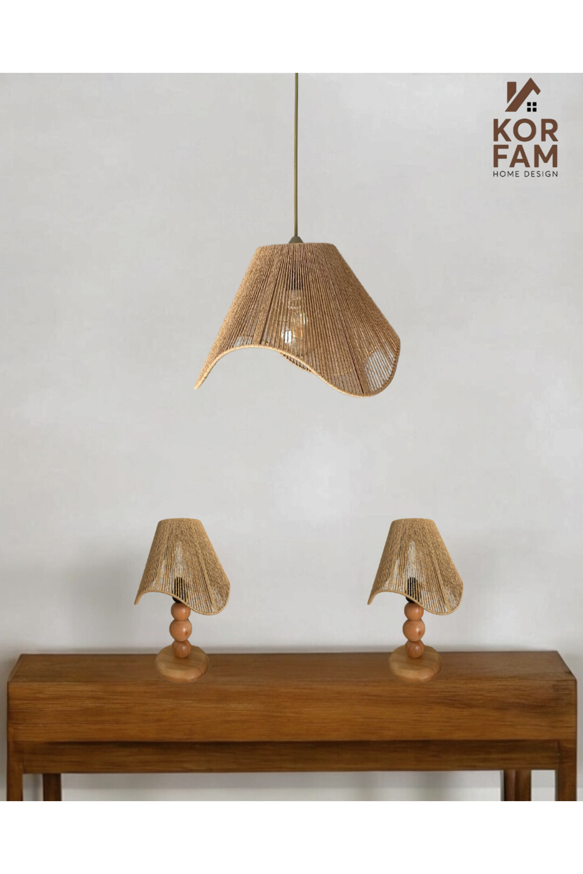 KorFam WAVY Modeli Avize & Abajur Set - Hasır El Yapımı Bohem Avize 2'li Ahşap Ayaklı Rustik Abajur Set