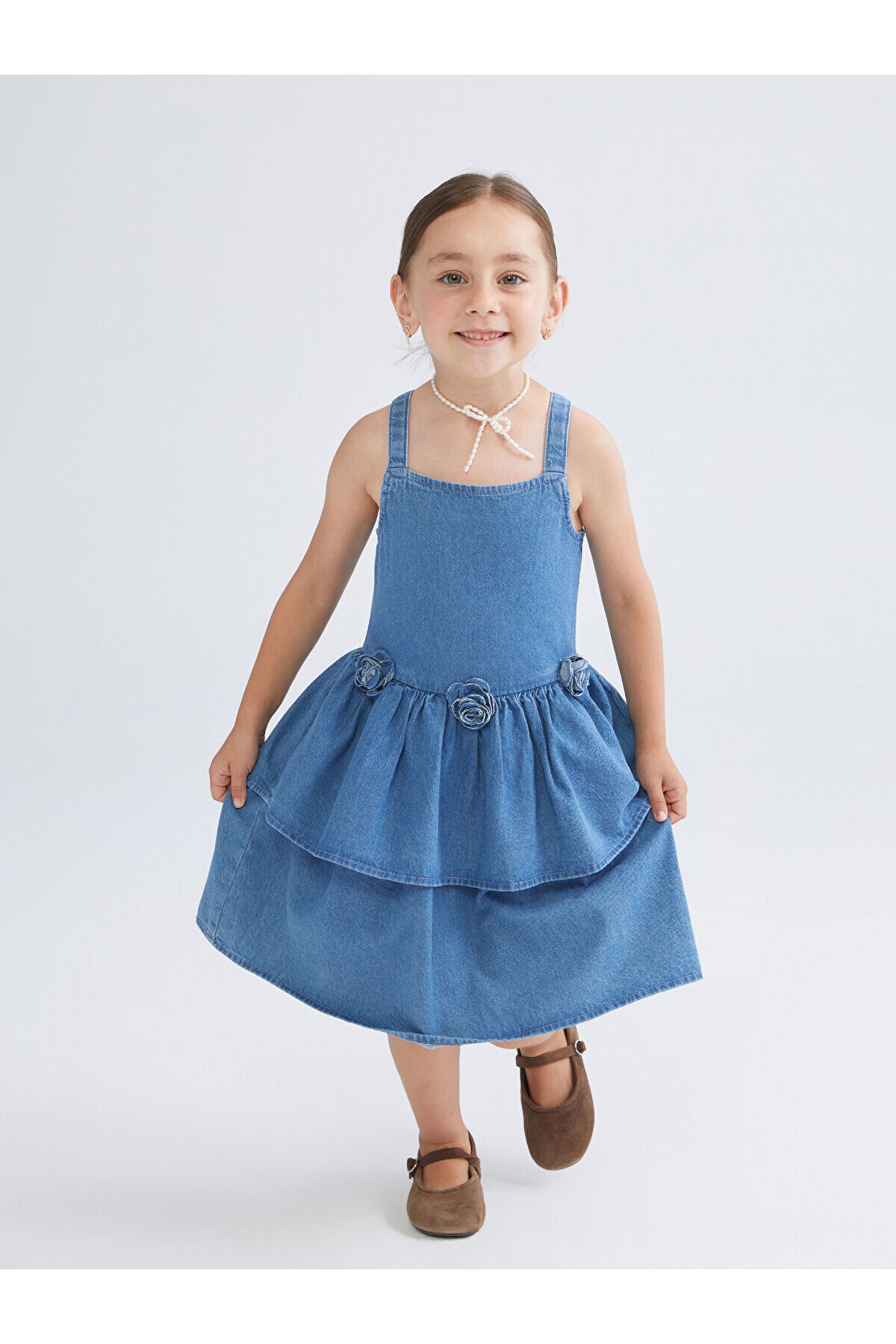 LC Waikiki Çiçek Aplikeli Kız Çocuk Jean Elbise