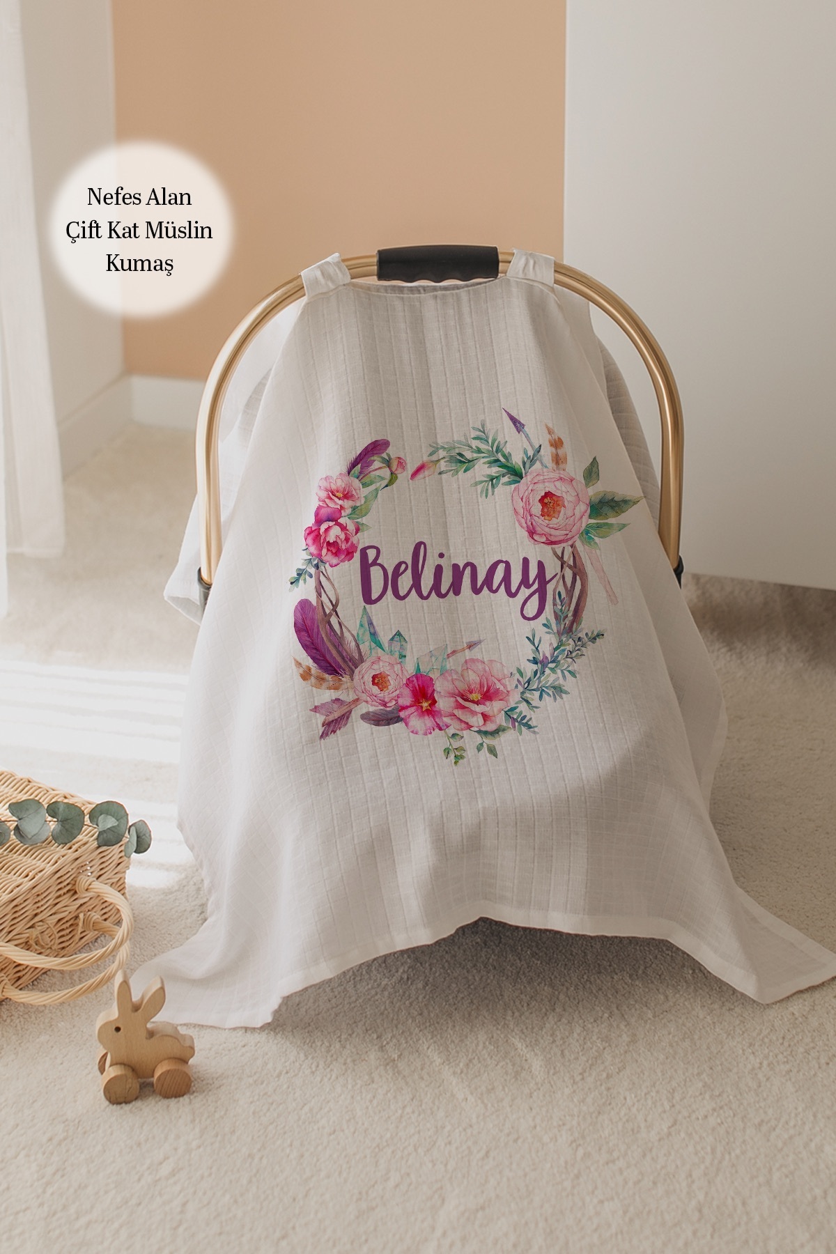 Lilabio %100 Pamuk İsme Özel Çift Katlı Müslin Puset Örtüsü - Çiçek Çemberi