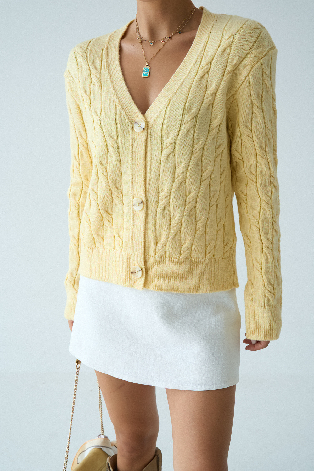 LOOSH Kadın Sarı V Yaka Kalın Örgü Desenli Triko Hırka Özellikleri