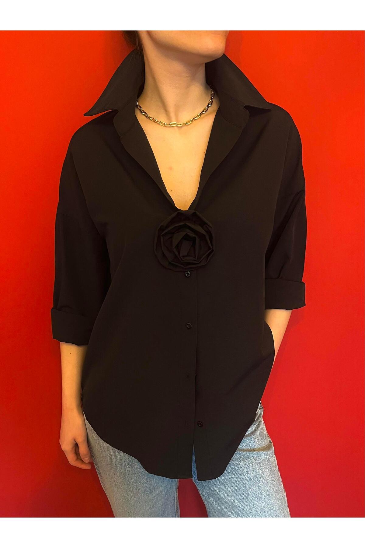 MADAME E. Oversize Uzun Basic Gül Aksesuarlı Gömlek Siyah