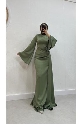 4048+ ÜrünDans Tekstil Taş İşlemeli Kol ve Yırtmaç Detaylı Abiye Saks