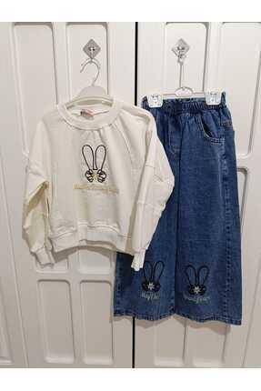 DİLARABUTİK Kız Çocuk Beyaz Bluz ve Kot Etek Takımı