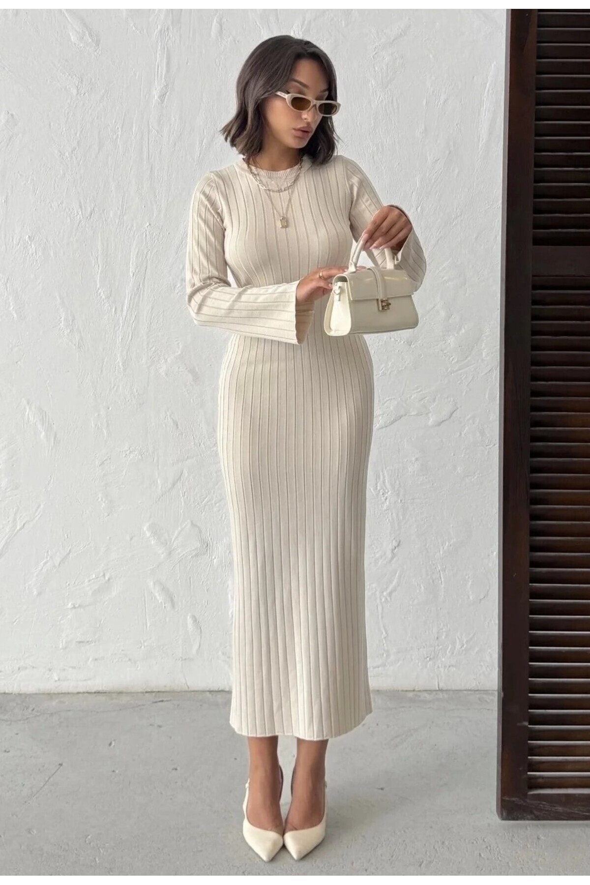 MAXXANA Zarif Uzun Boy Triko Elbise - Ekru