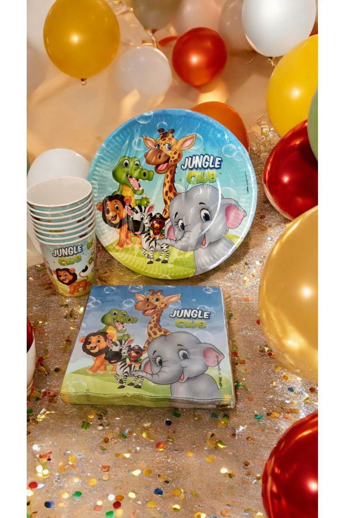 merni Jungle Club Safari Hayvanları Aslan Fil Zebra Desenli Renkli Baskılı Kağıt Peçete Tabak Bardak Set