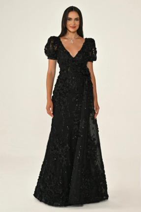 9378+ ÜrünRENGIN Göğsünde büyük çiçekli krep abiye elbise