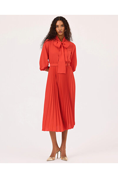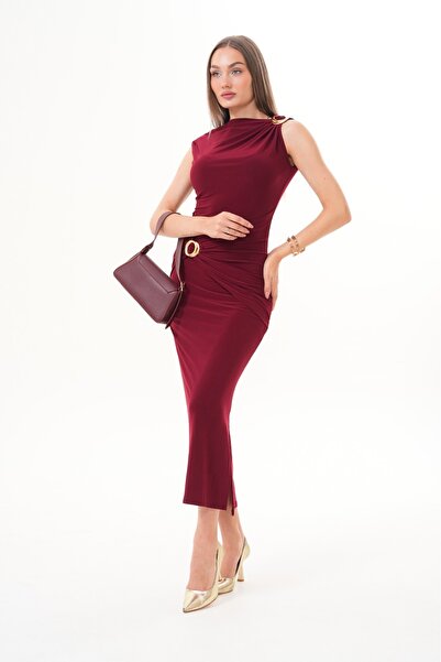 MILANOFOX Bordo Bel Detaylı Çift Tokalı Drapeli Sandy Kumaş Şık Midi Elbise - Özel Gün, Davet ve Gece Elbisesi