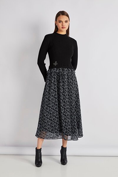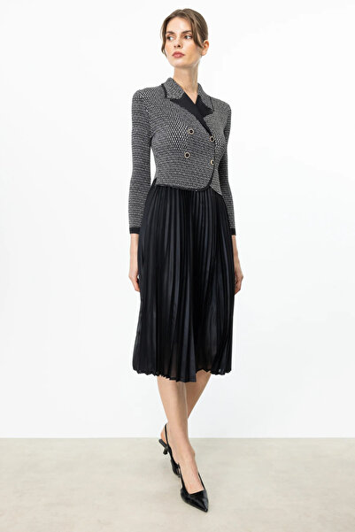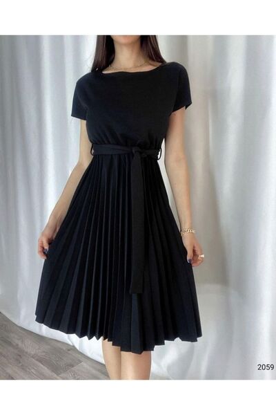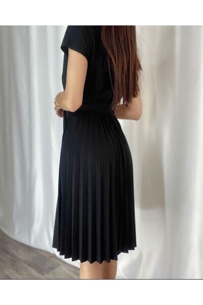Ekol Akordiyon Kumaş Midi Boy Elbise Siyah