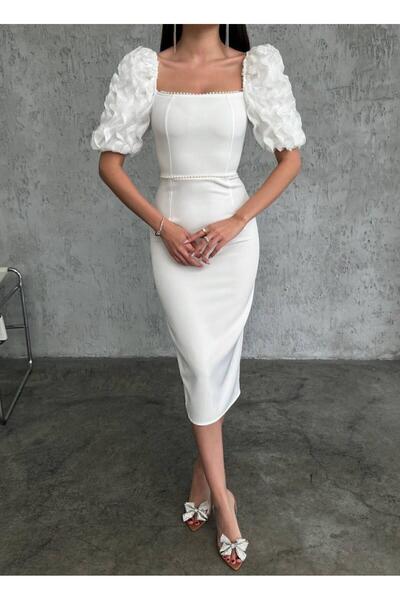 Glysso Özel Tasarım İnci Detaylı Balon Kol Beyaz Abiye Elbise
