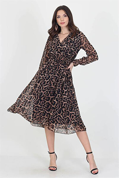 Neşeli Butik Kadın Kuşaklı Leopar Desenli Şifon Elbise Rssn07