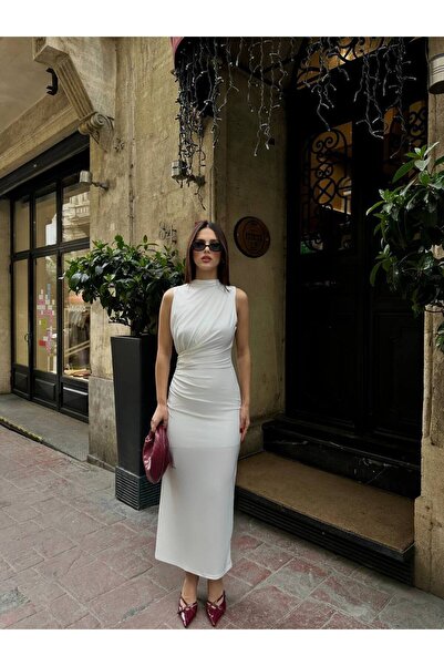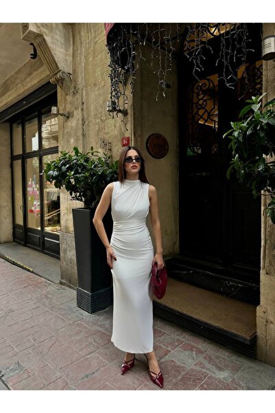 NovaRopa Astarlı Arkası Yırtmaçlı Drape Detaylı Elbise-MX00015
