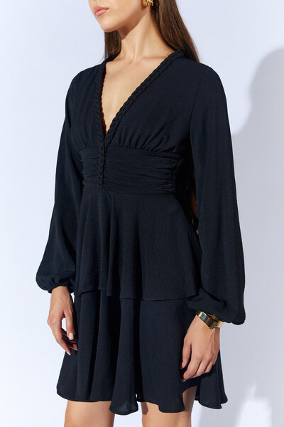 Manche Yakası Örgülü Uzun Kol Katlı Elbise - Siyah | MKW289813-01