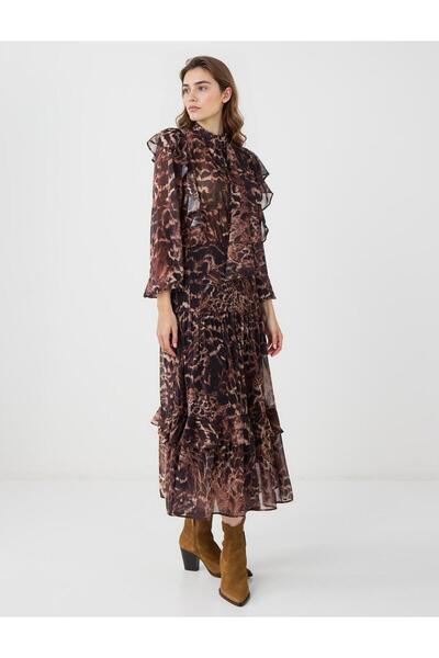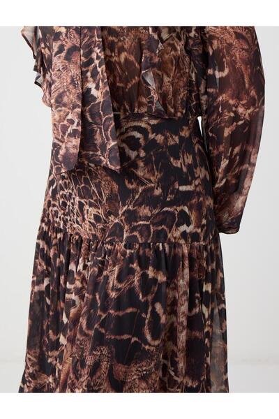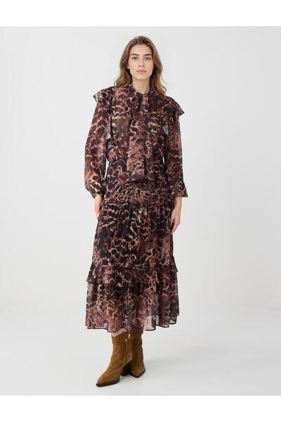 Jimmy Key Acı Kahve Boyundan Bağlı Uzun Kollu Desenli Şifon Midi Elbise