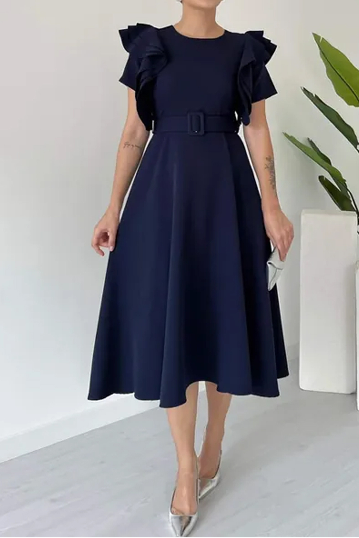 MILANOFOX Omuz Fırfır Detaylı Kemerli Atlas Krep A-Line Midi Boy Elbise