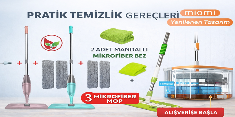 Miomi Mop Sprey Mop, Pratik Temizlik Seti + Temizlik Fırçası Hediyeli 3 Bezli ( Distribütör Garantili )