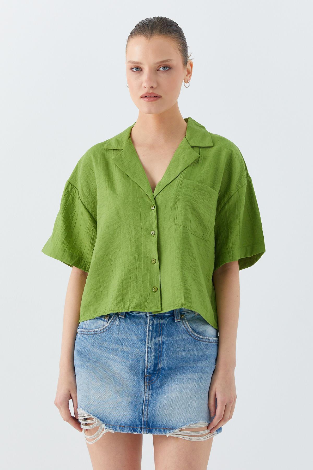 Mixray 4556 Kadın Cepli Basic Crop Gömlek Olive