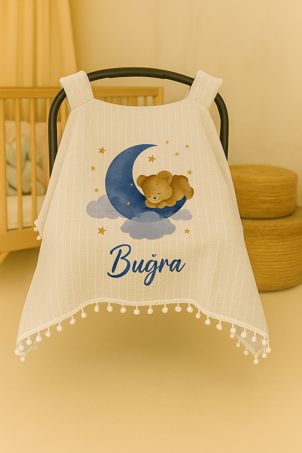Moda Lime Kişiye Özel Mavi Ay ve Uyuyan Ayıcık Desenli Bebek Puset Örtüsü – İsim Yazılı, %100 Pamuk