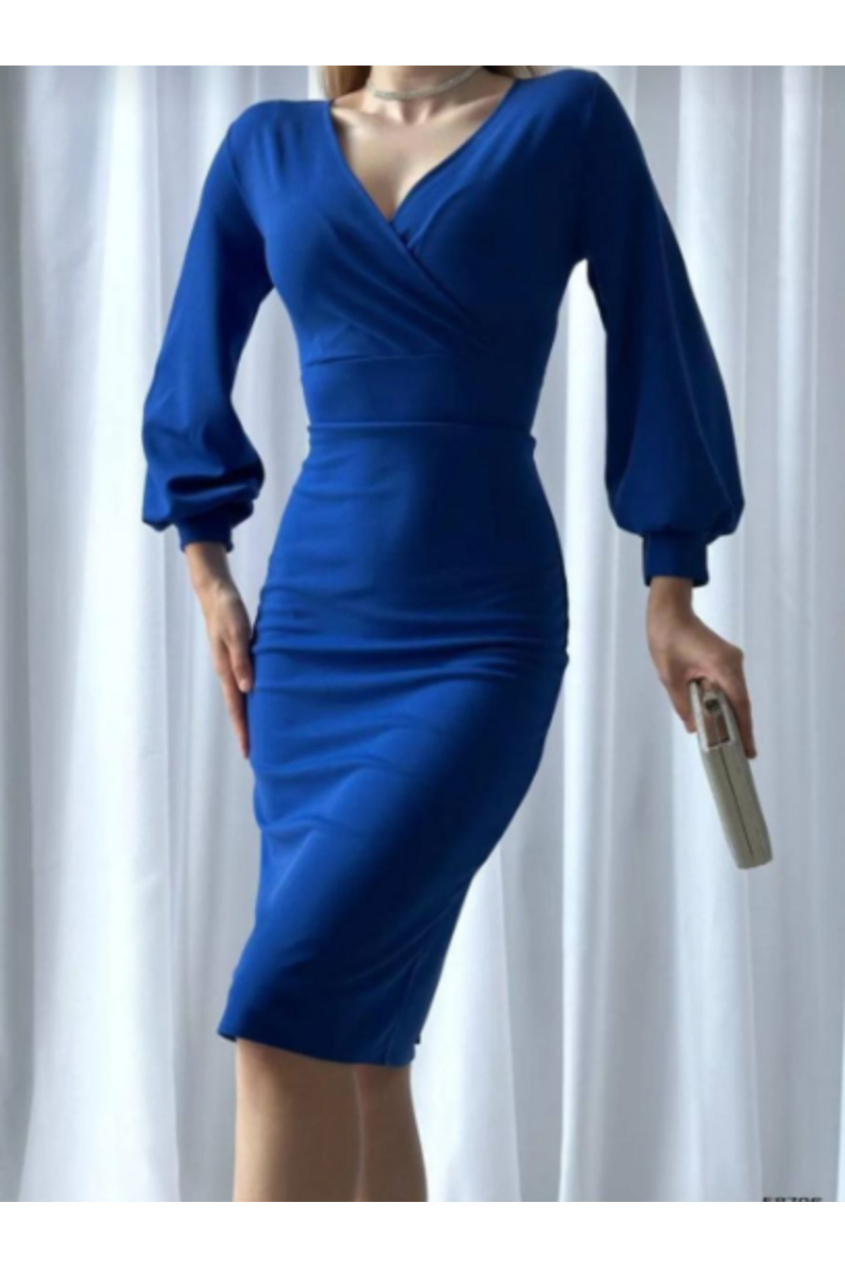 Modafeminen Kruvaze Yaka Uzun Kollu Ithal Krep Kumaş Midi Boy Abiye Elbise
