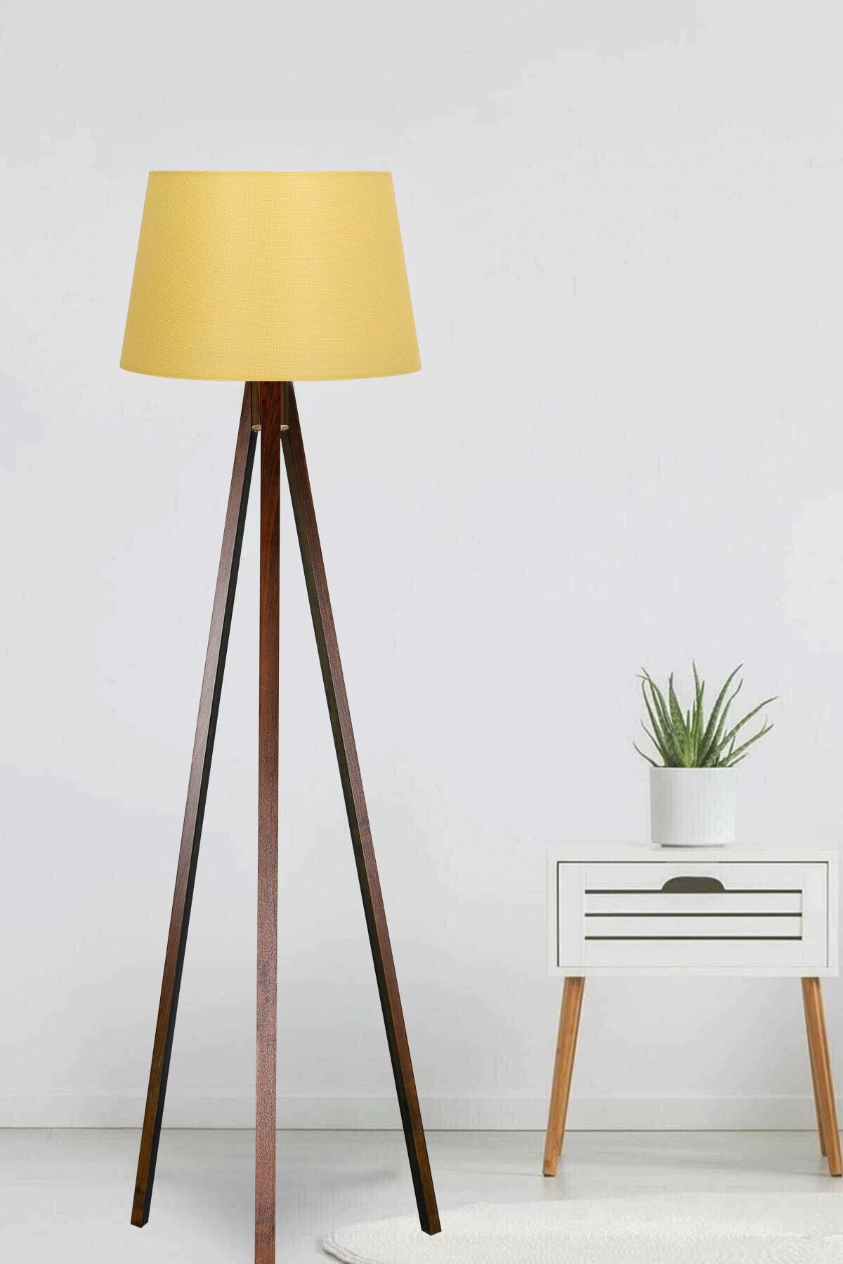 modamvip 3 Ayaklı Lambader Tripod Ayak Üç Ayaklı Ahşap Abajur Konik Kumaş Sarı Başlık Kahverengi Ayak Özellikleri
