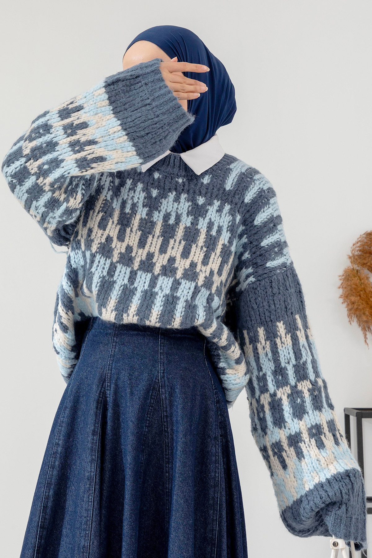 MODAQU Üç Renk Kalın Örme Kazak - İndigo