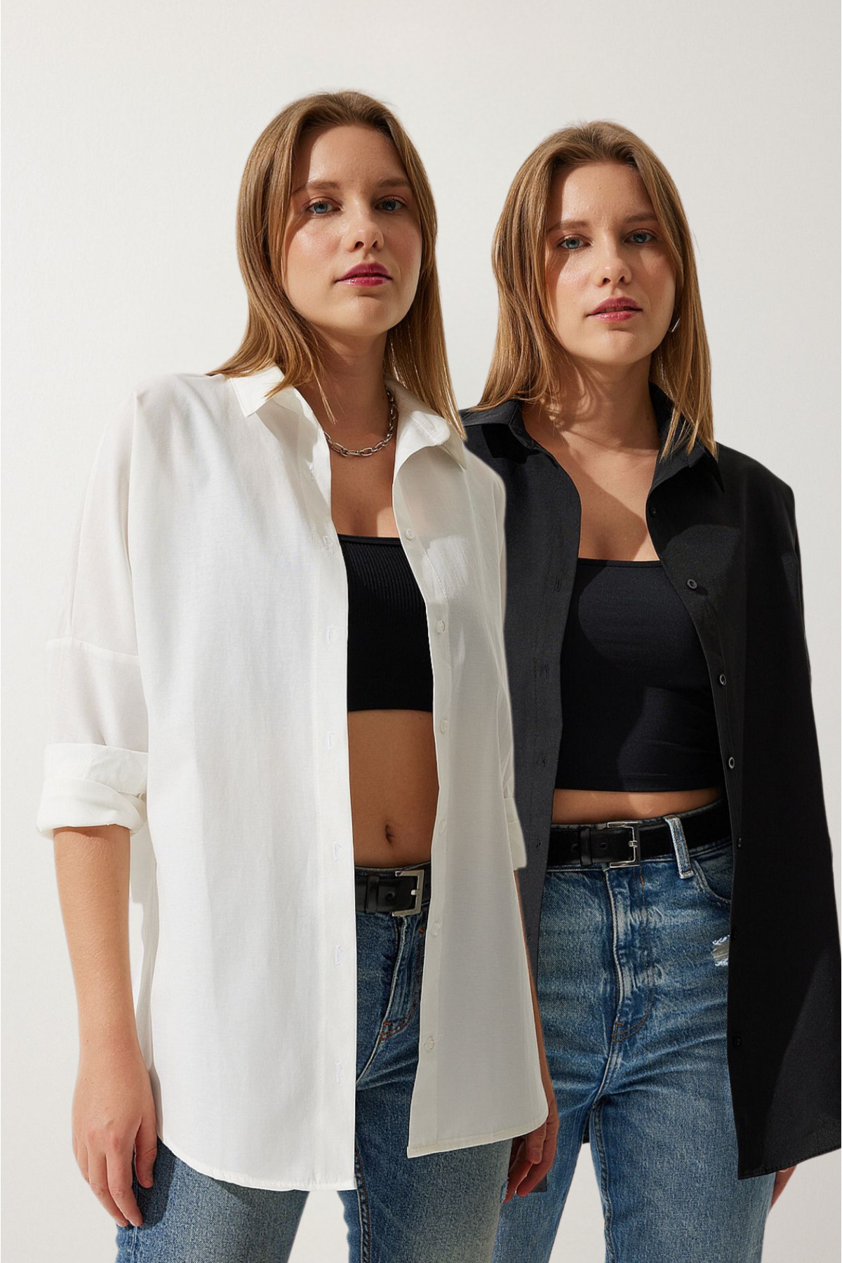 Modark Kadın Siyah Beyaz 2'li Oversize Uzun Basic Gömlek