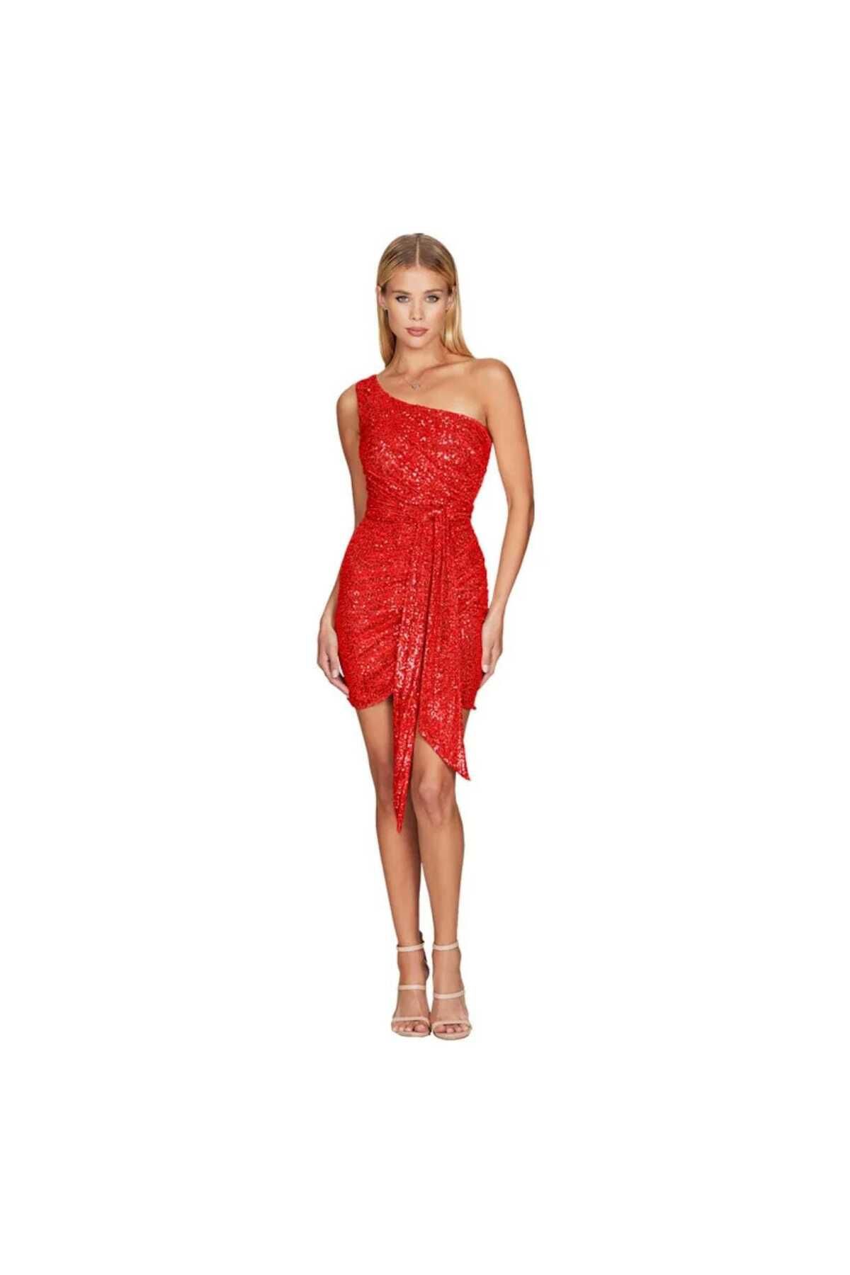 modas TEK OMUZLU YIRTMAÇLI MİNİ PUL PAYET ABİYE ELBİSE