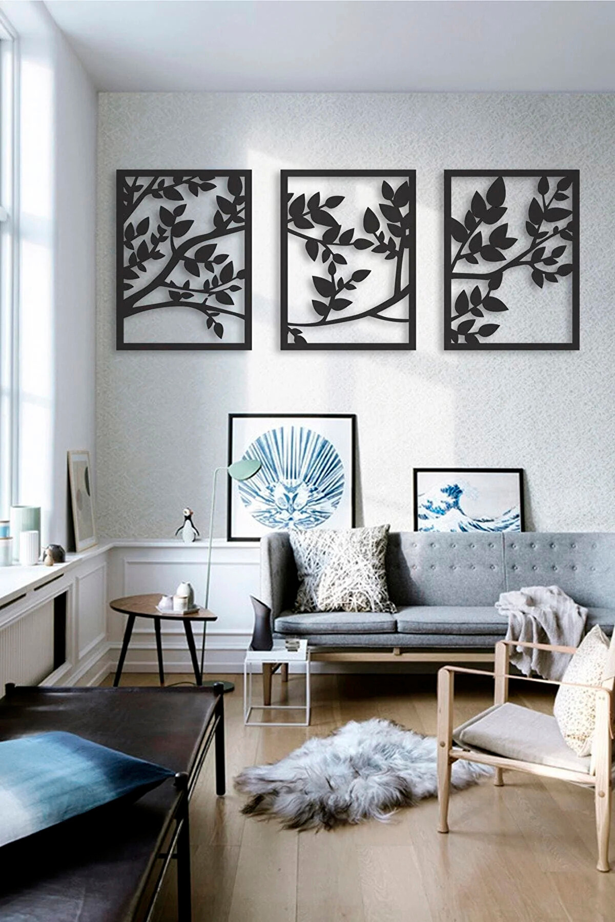 MODAT Üçlü Dal Ve Yaprak Desenli Ahşap Dekoratif Duvar Tablosu